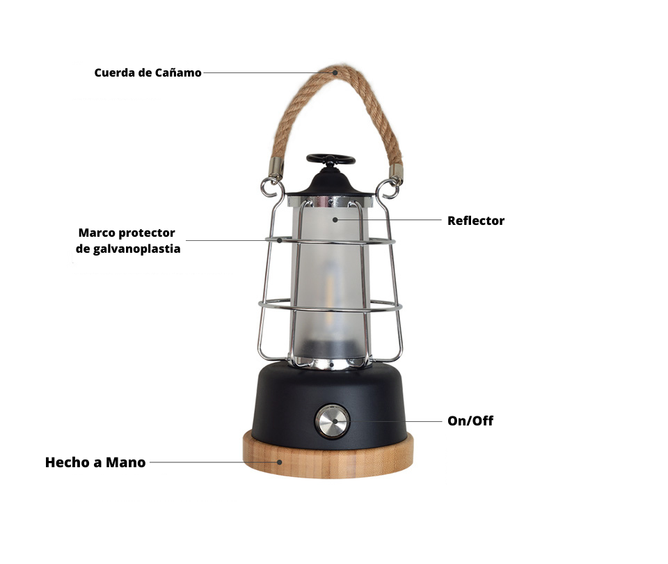 Diseño práctico y exclusivo, Bamboo y cuerda de cáñamo, luz LED regulable en intensidad y recargable.